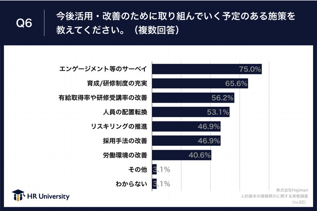 また、「はい」と回答した方に、「Q6.今後活用・改善のために取り組んでいく予定のある施策を教えてください。(複数回答)」(n=32)と質問したところ、以下のような回答となりました。