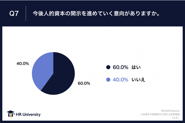 Q1で「開示準備に着手できていない」と回答した方に、「Q7.今後人的資本の開示を進めていく意向がありますか。」(n=5)と質問したところ、「はい」が60.0%、「いいえ」が40.0%という回答となりました。
