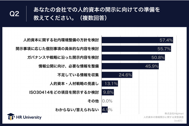 また、「開示準備が整っている」「開示準備をしている最中」と回答した方に、「Q2.あなたの会社での人的資本の開示に向けての準備を教えてください。(複数回答)」(n=61)と質問したところ、以下のような回答が得られました。