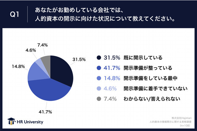 「Q1.あなたがお勤めしている会社では、人的資本の開示に向けた状況について教えてください。」(n=108)と質問したところ、「既に開示している」が31.5%、「開示準備が整っている」が41.7%という回答となりました。