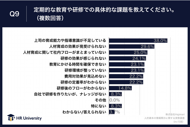 「Q9.定期的な教育や研修での具体的な課題を教えてください。(複数回答)」(n=108)と質問したところ、「上司の育成能力や指導意識が不足している」が38.0%、「人材育成の効果が見受けられない」が29.6%、「人材育成に関して社内フローがまとまっていない」が25.0%という回答となりました。