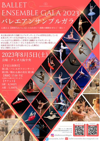 ■日程 2023年8月5日(sat)■会場クレオ大阪中央 〒543-0002 大阪市天王寺区上汐 5-6-25■アクセス1.四天王寺前夕陽ケ丘[1](3分)2.谷町九丁目[5(谷町九丁目駅)](10分)3.大阪上本町[近鉄12](11分)■演目第1部/バレエガラコンサートー国内外で活躍するプロバレエダンサーの饗宴ー第2部/眠れる森の美女 第3幕ープロバレエダンサーと未来のプロダンサーの共演ー■出演ダンサー・東野瑞生(ポーランド/ポーランド州立オペラノババレエ・ソリスト)・中野吉章(アメリカ/ピッツバーグバレエシアター プリンパル) 他他出演ダンサーはこちら▼https://www.ballet-ensemble-gala-concert.com/vol-1-%E5%A4%A7%E9%98%AA-2022%E5%B9%B47%E6%9C%88/%E3%83%97%E3%83%AD%E3%83%80%E3%83%B3%E3%82%B5%E3%83%BC%E7%B4%B9%E4%BB%8B/ ■チケット料金S席:¥8500A席:¥5500■チケット販売開始日2023年4月27日(木)〜■昨年のバレエアンサンブルガラの様子
