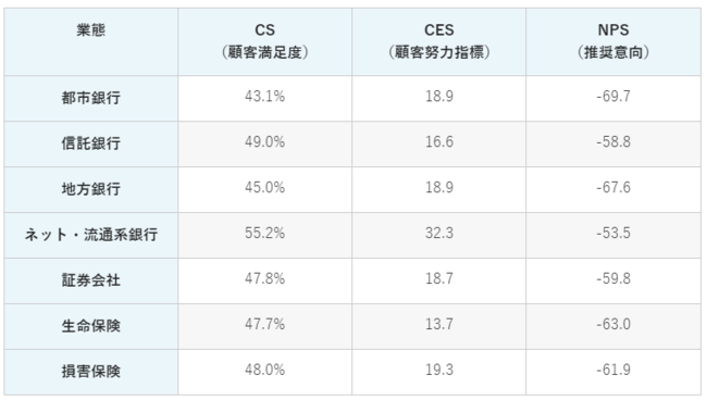 調査ではそれぞれの金融機関の利用者にCSのほか、近年ロイヤルティー指標として注目されているNPS、CES(Customer Effort Score 顧客努力指標)など多角的な項目について評価を聴取しており、評価した理由も自由記述で質問しています。