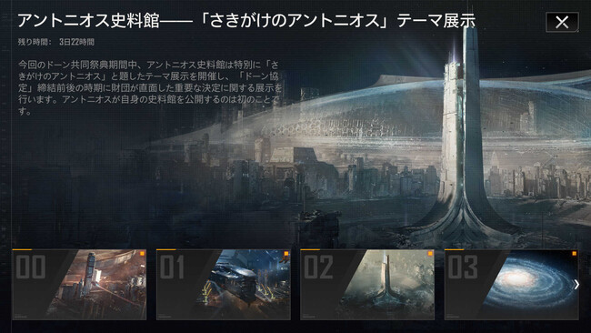 今回のドーン共同祭典のホストであるアントニオスは、アントニオス史料館にて「さきがけのアントニオス」と題した展示会を開催しています。アントニオスが自身の史料館を公開するのは初のことです。この史料館は数千年以上の歴史があり、館内の歴史資料もアントニオスによる星系開拓史が記録されています。