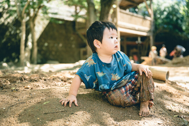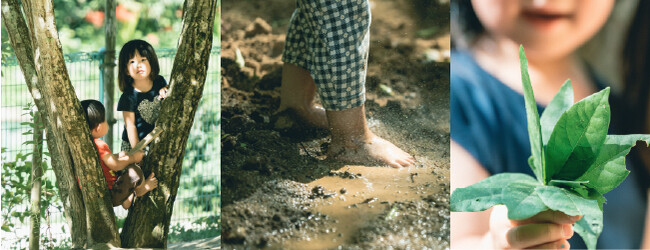 もぐし海のこども園の園庭には、遊具がありません。あるのはどろんこ、葉っぱ、石ころといった自然素材ばかり。園の周りも、原生林の山やホタルが飛ぶ小さな川に囲まれています。自然とふれあいながら、子どもたちは自ら見つけ、ひろげて、深めて、ともに遊ぶことを繰り返します。自然と一体となり、働きかけ、抱かれる経験は一人ひとりの表現力や創造性を育み、子どもの「生きる根っこ」となります。