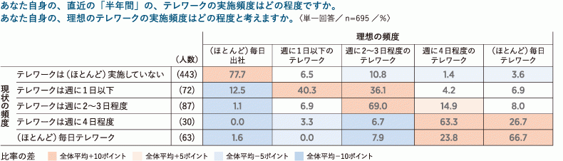 ・テレワーク実施頻度の現状と理想についての解答は、それらが一致する対角線上に最も多く分布している。