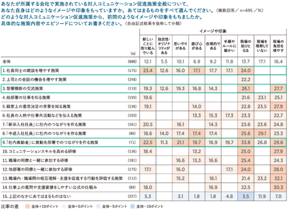 ・“新しいことに取り組んでいる”“思いやりがある”“遊び心がある”など、受け手の感情を動かすイメージや印象については、“1.社員同士の雑談を増やす施策”“3.部署横断の交流施 策”“9.「社内異動者」に異動先部署でのつながりを作る施策”に着目し、そのようなイメージや印象をもった理由や具体的なエピソードについての記述を抜粋した。