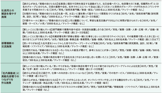 ⇒コミュニケーションの活性化は現場社員の一定の労力や時間を伴うことが避けられず、効果を見据えて取捨選択しつつも信念をもって大胆に行う必要がありそうだ。