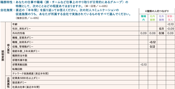 ⇒職務上で、影響を与える相手や協力すべき相手が多くまた明示的であることが、職場内や他部署との相談・協力し合うつながりを活性化する。のみならず、社外越境のつながりに学びアイディアを得ることや、家族・知人との親しいつながりを豊かにすることをも動機付けるようである。