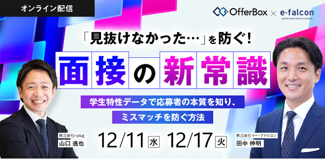 学生と企業をつなげる新卒オファー型就活サービス「OfferBox(オファーボックス)」を運営する株式会社i-plug(本社:大阪市淀川区、代表取締役 CEO:中野智哉)は、学生の本質を見抜く『面接の新常識』と具体的なノウハウを解説するセミナーを12月11日(水)と17日(火)にオンラインで開催します。