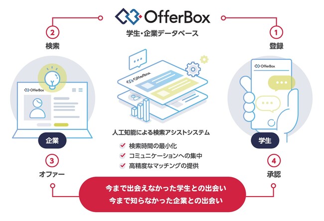 OfferBoxは企業から学生にオファーを送るオファー型の新卒採用サービスです。企業は「会いたい学生」の情報を検索して効率的にアプローチができます。学生は、知らない企業や業界からのオファーにより自身の可能性を拡げることが可能です。