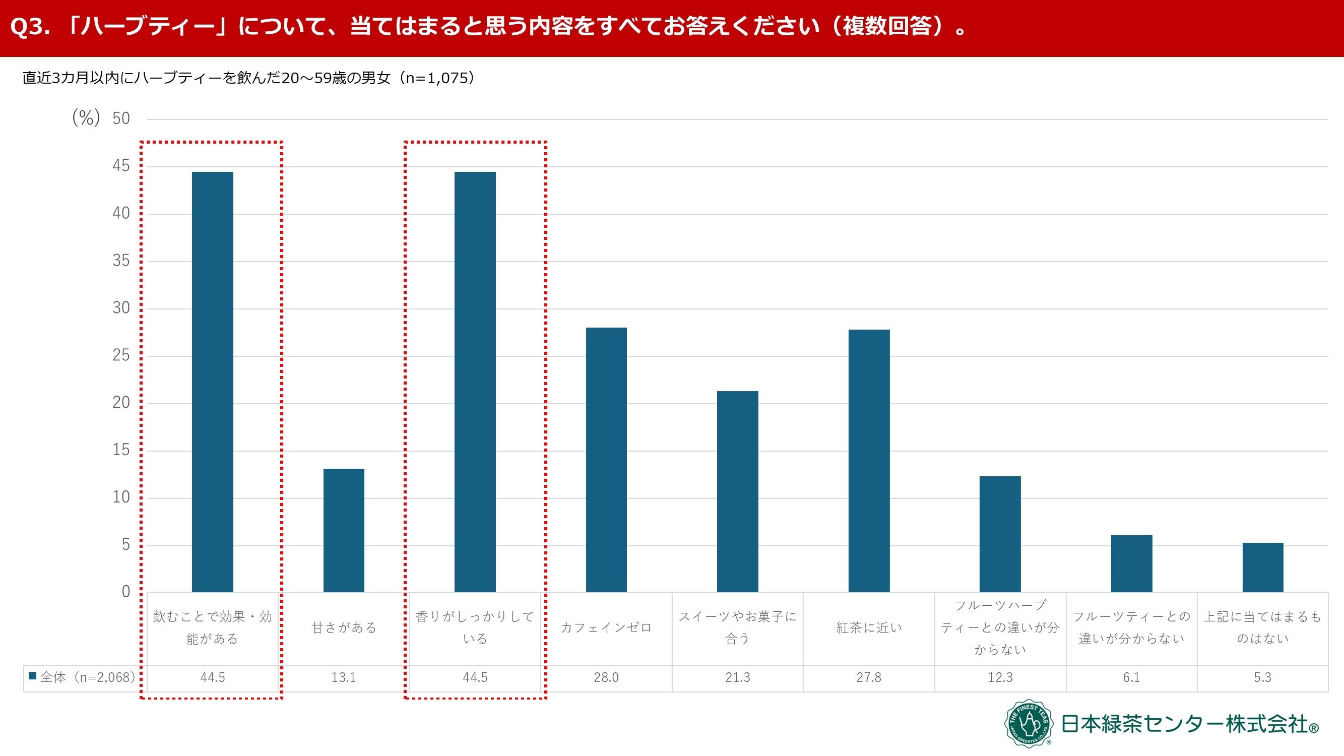 [画像2: https://prcdn.freetls.fastly.net/release_image/50080/135/50080-135-7d69a5fec6ee528e22220ec30b933437-2667x1500.jpg?width=536&quality=85%2C75&format=jpeg&auto=webp&fit=bounds&bg-color=fff ]20〜59歳の男女の中で「直近3ヶ月以内ティーバッグ形式の飲料の飲用頻度が【月に1回未満〜週5回以上】と回答した方々」から各飲料の飲用頻度を質問したところ、ハーブティーは64.9%。今回集計した4種の飲料※3の中でパーセンテージが最も大きい結果となりました。