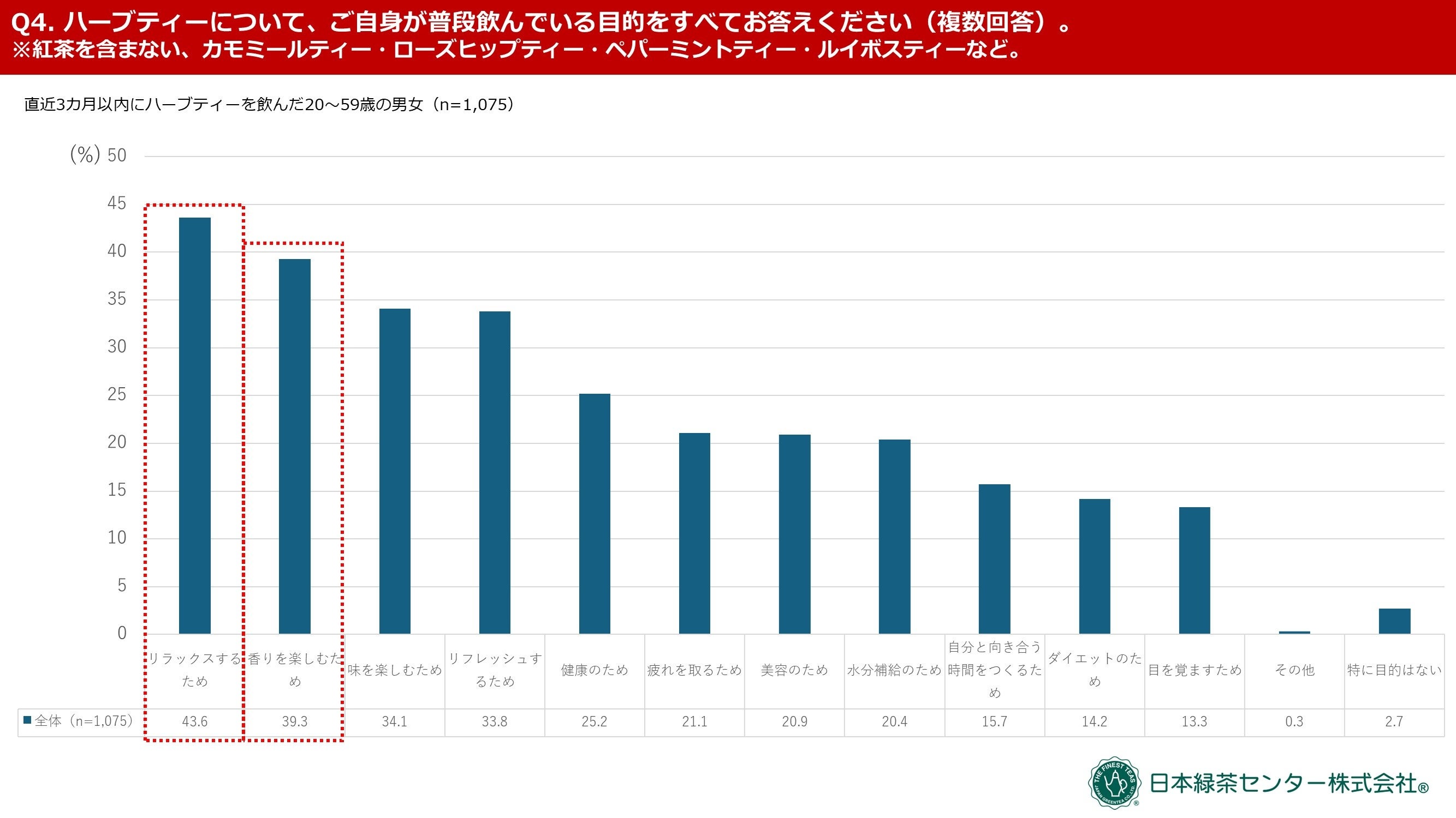 さらに、直近3カ月以内にハーブティーを飲んだ方々に飲用目的を質問したところ、【リラックスするため】が最も多くて43.6%、【香りを楽しむため】が39.3%でした。