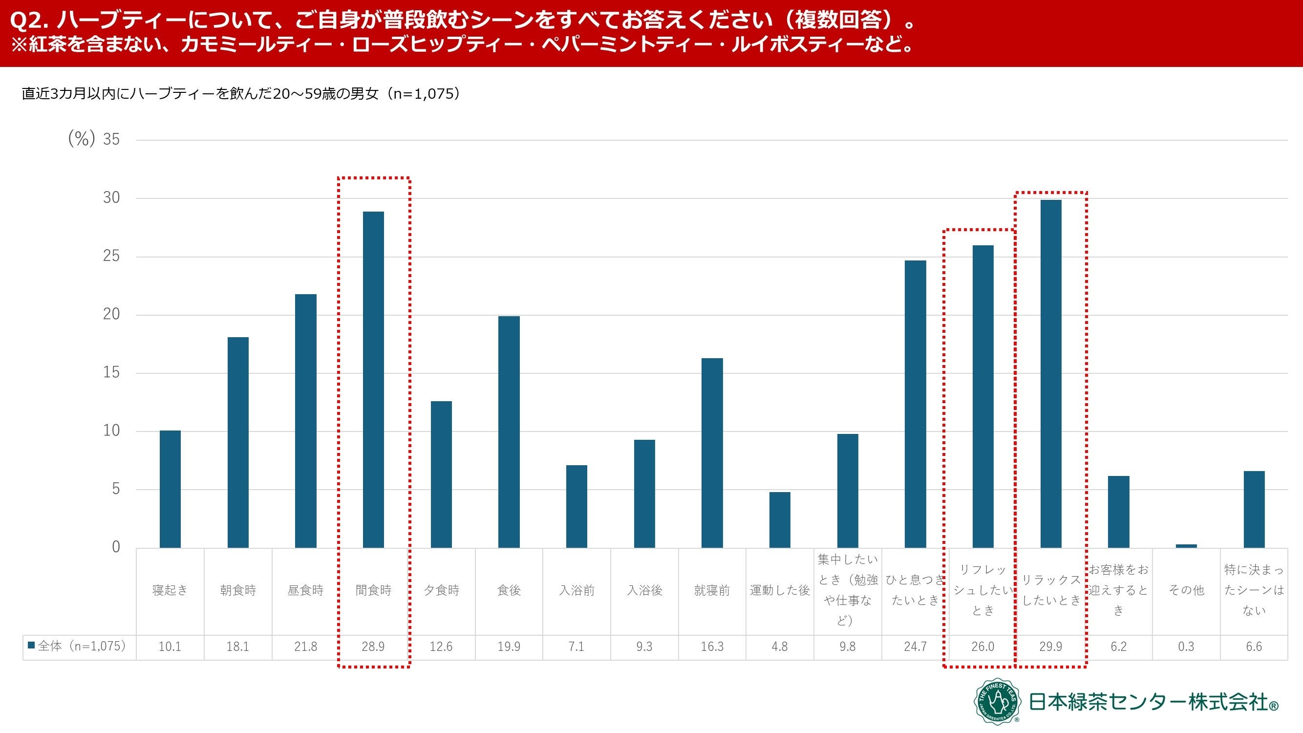 [画像3: https://prcdn.freetls.fastly.net/release_image/50080/135/50080-135-b81cff568e8af042e3bd9f7f6af1c2e4-2667x1500.jpg?width=536&quality=85%2C75&format=jpeg&auto=webp&fit=bounds&bg-color=fff ]続いて、ハーブティーの飲用シーンを質問したところ、【リラックスしたいとき】が一番多くて29.9%、次点で【間食時】が28.9%、三番目が【リフレッシュしたいとき】で26.0%という結果となりました。