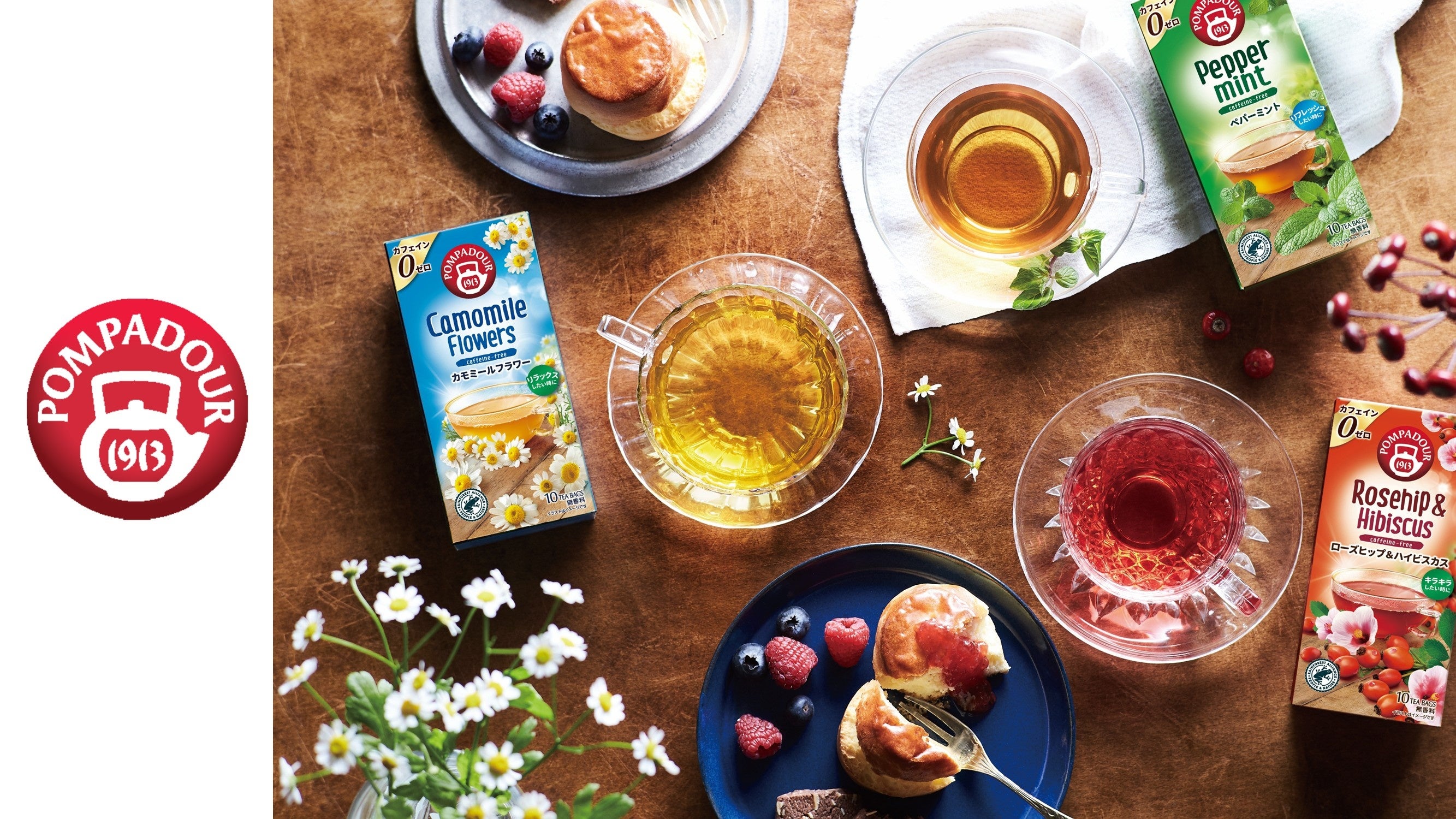 [画像6: https://prcdn.freetls.fastly.net/release_image/50080/135/50080-135-f427030978d10992da69fc10dab415e6-2667x1500.jpg?width=536&quality=85%2C75&format=jpeg&auto=webp&fit=bounds&bg-color=fff ]「ポンパドール」は、1882年創業のドイツの老舗ティーメーカー・ティーカネン社が、1913年に立ち上げたハーブティー専門ブランド※7 です。専門家たちが集めた良質なハーブやフルーツから生まれる商品は、現在では世界中で広く愛されています。