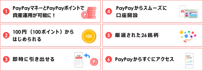 2022年8月には、PayPayアプリ上で有価証券の取引ができる「PayPay資産運用」の提供を開始。PayPayマネーとPayPayポイントを使い100円(100ポイント)からETF・投資信託あわせて26銘柄の取引ができます。