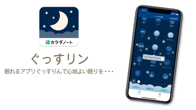 「ぐっすリン」は、就寝時に癒しサウンドを聴きながら快適に眠っていただくことを目的に開発された快眠音アプリです。配信する癒しサウンドは常時43曲を配信し、雨・森などの自然の音に加え、動物や虫の鳴き声から電車内、木魚など豊富なバリエーションがあり、また、複数のサウンドを組み合わせて好みのサウンドにすることが可能です。