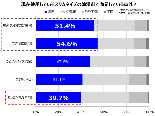 水がたまるスリムタイプの除湿剤について、今回当社が独自に調査したところ、ユーザーの多くが、場所を取らずに設置できる点やすき間に使える点に満足している一方で、除湿量にあまり満足していないことが分かりました(下図参照)。