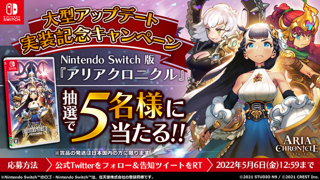 株式会社CREST(以下「CREST」)は、STUDIO N9開発の『ARIA CHRONICLE -アリアクロニクル-』(以下『アリアクロニクル』)Nintendo Switch(TM)版に於いて本日大型アップデートを実施したことをお知らせ致します。