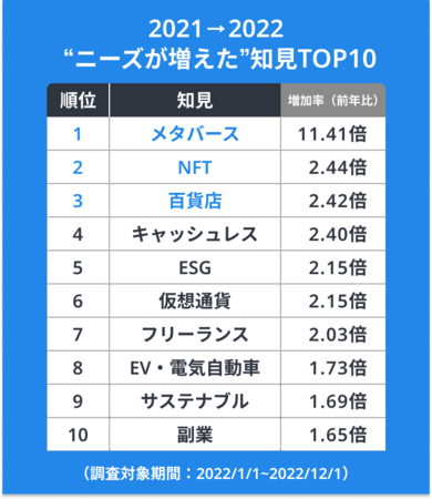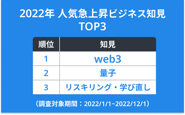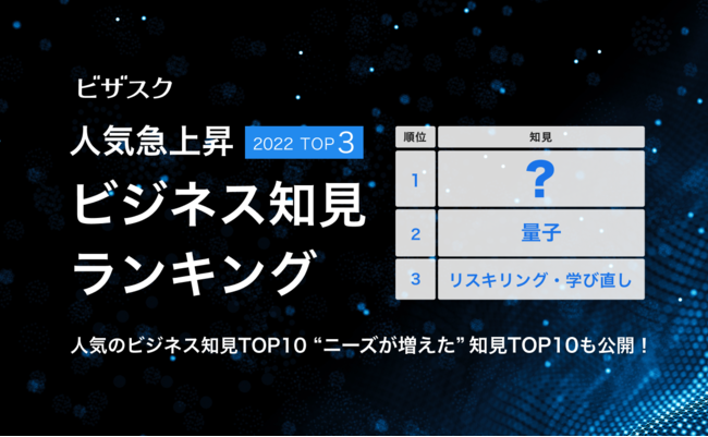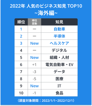 今回ランキングを発表するのは、(1)2022年人気のビジネス知見TOP10 (2)2021→2022 “ニーズが増えた”知見TOP10 (3)2022年人気急上昇のビジネス知見TOP3 (4)2022年 人気のビジネス知見~海外編~TOP10 です。