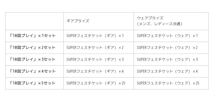 イベント期間中、ギアプライズには、「超パワーモード」と「無風」のスキルが2つ付いた新ギアが登場します。また「10回プレイ」では5セット目までおまけとして「SUPERフェスチケット(ギア)」を最大25枚プレゼントいたします。