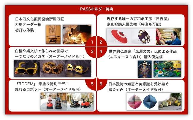 JAPAN MADE PASSホルダーは、JAPAN MADE COMMUNITY内で行うイベントへの参加権や、JAPAN MADE PASSホルダーのみが入れるECサイト(JAPAN MADEストア)へのアクセス権が付与されます。JAPAN MADEストアでは、一般的には購入できない日本製品の販売や、世界遺産に登録されているような歴史的建造物で行うイベント等への参加優先権の販売などを提供していく予定です。
