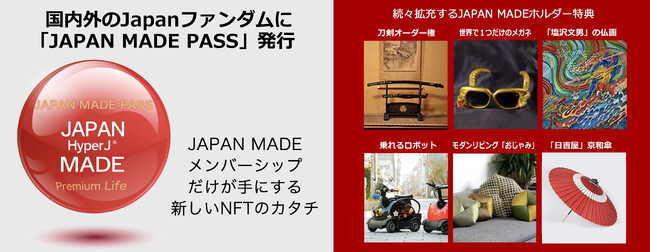 JAPAN MADE PASSは地域の特産品の購入や品質の高い日本製製品の購入を通じて、日本企業や日本文化、地域を応援できるNFTです。日本は、これまでに、品質がよく、人々に有益な良いものをたくさん開発し、人間社会に大きく貢献してきました。そして、日本製製品は、人々の生活を豊かにし、生き方の格を上げるようになりました。この日本製製品がもつ品質を維持・向上させることは、使う人にも大きなメリットをもたらします。JAPAN MADE社は、品質が良い日本製品を作る企業をサポートし、日本製の良い「もの」で世界の日本製品愛好家の方たちと幸せな気分をシェアしたいと考えています。