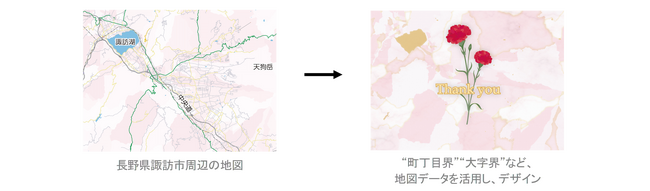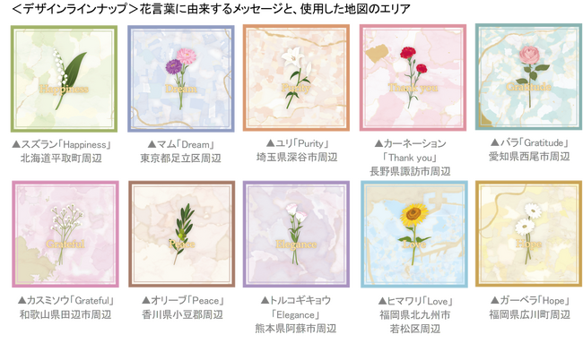 「街まち Bloom series」は、10種類のお花をモチーフにした、さりげない地図デザインのアイテムです。背景の大理石のようなマーブル模様は、ゼンリンの地図データをもとに、それぞれのお花の生産地など、ゆかりのあるエリアの地図を使用しています。“海や川、湖などの水域”や“町丁目界”、“大字界”などの区分を生かして、マーブル調にデザインし、花言葉に由来するメッセージを添えました。