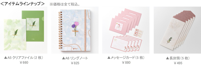 10種類のデザインを「A5クリアファイル」「A6リングノート」「メッセージカード」「長封筒」4つのアイテムで展開します。