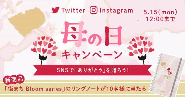 「街まち Bloom series」の発売にあたり、「母の日キャンペーン」を開催します。「Map Design」公式SNSアカウントをフォロー&発信用画像を使って「ありがとう」の気持ちをSNSで投稿いただいた方を対象に、抽選で10名様にお好きなデザインのA6リングノート1冊をプレゼントします。