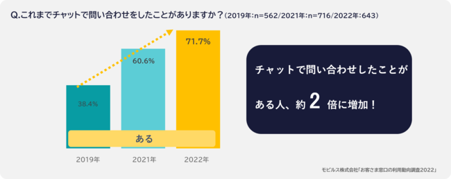 これまでチャットで問い合わせをしたことが「ある」と回答した人は、2019年(38.4%)、2021年(60.6%)、2022年(71.7%)を比較すると、年々増加しています。4年間では、約2倍以上(38.4%⇒71.7%)増加したことがわかりました。