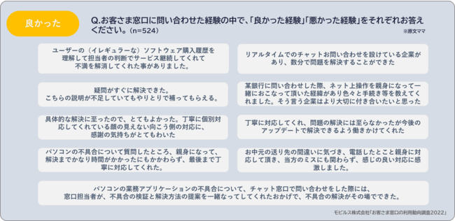 一方で、「お客さま窓口の利用経験」として「良かった経験」を聞いたところ、「要望をくみ取ってくれて、丁寧に親身に対応してくれた」「聞いたこと以上の情報を教えてくれた」「意図をくみ取ってくれた」「解決はしなかったが丁寧な対応で信頼できた」といった「人ならでは」の良さが感動経験に繋がっていることが分かりました。