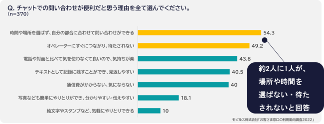 「チャットでの問い合わせが便利な理由」を聞いたところ、約2人に1人が「時間や場所を選ばず、自分の都合に合わせて問い合わせができる」(54.3%)、「オペレーターにすぐつながり、待たされない」(49.2%)と回答しました。5人に2人以上(43.8%)は「電話や対面と比べて気を使わなくて良いので、気持ちが楽」と答えています。