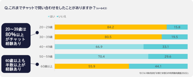 チャットでの問い合わせ経験を年代別に見たところ、20〜39歳は80%以上の人が経験ありと回答しました。また、意外にも60歳以上も55.9%と半数以上が経験ありと回答し、年代に関わらず問い合わせ手段としてチャットの利用が浸透してきている結果でした。