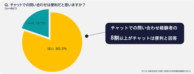 本調査の結果、チャットでの問い合わせ経験をしたことがある人は71.7%と年々増加し、4年間では約2倍に増えていることが分かりました。さらに、チャットでの問い合わせ経験がある人の中で、80.3%の人が、「チャットでの問い合わせは便利」だと回答しています。「時間や場所を選ばず、自分の都合に合わせて問い合わせができる」「すぐつながり、待たされない」「電話や対面と比べて気を使わなく良いので、気持ちが楽」「テキストとして記録に残るので見返しやすい」といった、チャットならではの利点を感じているようです。