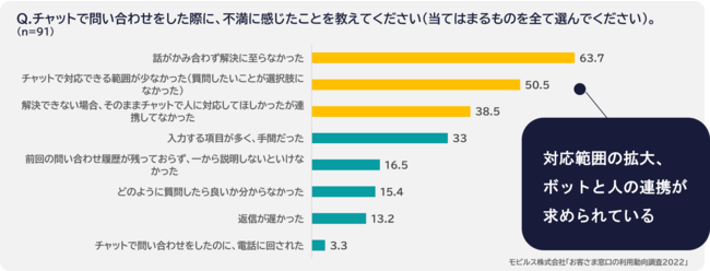 「チャットで問い合わせをした際に、不満に感じたこと」を聞いたところ、「話がかみ合わず解決に至らなかった」(63.7%)、「解決できない場合、そのままチャットで人に対応してほしかったが連携してなかった」(38.5%)が上位にあがり、チャットボット(自動応答)だけでは解決に導けないケースも多いことが伺えます。半数以上(50.5%)が「チャットで対応できる範囲が少なかった」と回答しており、チャットでの対応範囲の拡大も求められていることがわかりました。