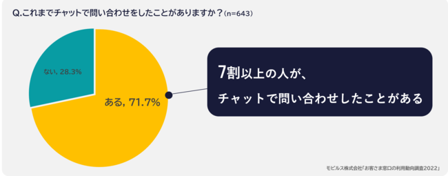 「これまでチャットで問い合わせをしたことがありますか?」と聞いたところ、71.7%が「ある」と回答しました。7割以上の人が、チャットでの問い合わせを経験したことがあると判明しました。