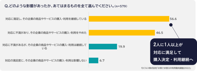 「お客さま窓口の対応が、企業のイメージや商品・サービスの購入に影響する」と答えた方に、「どのような影響があったか」聞いたところ、2人に1人以上(56.6%)が「対応に満足して、購入決定・利用継続」していることが分かりました。「対応に不満」があった際に、「購入・利用をやめた」人も46.6%と、窓口対応への満足度が購買決定に大きく影響している結果がでました。