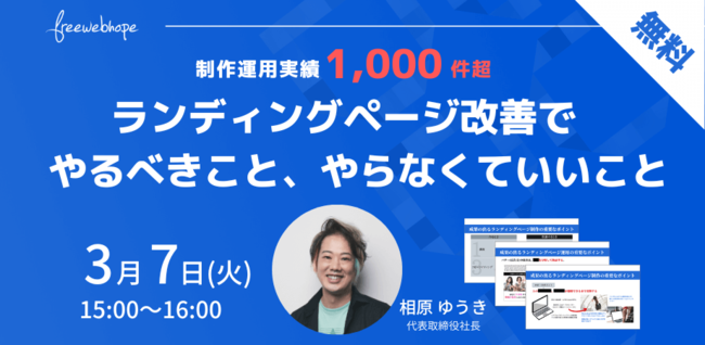 株式会社free web hope(本社:東京都中央区、代表取締役:相原ゆうき)は、無料のオンラインセミナー「制作運用実績1,000件超 ランディングページ改善でやるべきこと、やらなくていいこと」を3月7日(火)に開催いたします。(申し込みフォーム:https://share.hsforms.com/1Wqv8SdTuT9e-Pbo1oL6xxw5fwo5)