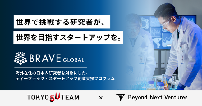 Beyond Next Ventures株式会社(本社:東京都中央区、代表取締役社長:伊藤毅、以下「当社」)は、海外在住の日本人研究者による世界展開を見据えたディープテック・スタートアップの創業を後押しする「BRAVE GLOBAL」を開催いたします。本プログラムに関心のある海外在住の研究者の方は、下記の公式ページよりご登録ください。本プログラムは、東京都が運営する多様な主体によるスタートアップ支援展開事業「TOKYO SUTEAM」の採択を受けて実施されます。