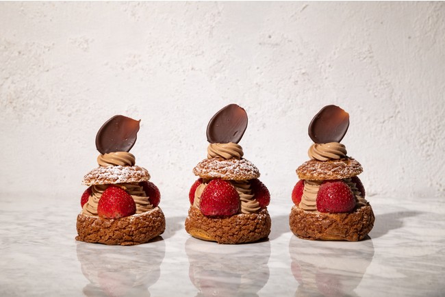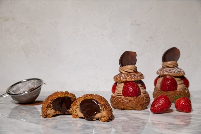また、店内限定メニューには、ケーキのようにいちごを贅沢にトッピングした「いちごとチョコレートのオープンシューサンド」をご用意。カスタードとホイップした生クリームをふんわりと混ぜ合わせた、口どけ良いオリジナルチョコレートクリームの中には、味わいに変化とコクを与えるアングレーズソースを忍ばせました。