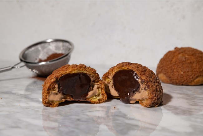 フワッと軽いチョコレートクリームと、とろっと濃厚なチョコレートクリームの2種類の口当たりのコントラストをお楽しみいただけるの「フォンダンショコラシュー」。ザクザクの香ばしいシュー生地との相性も抜群です。