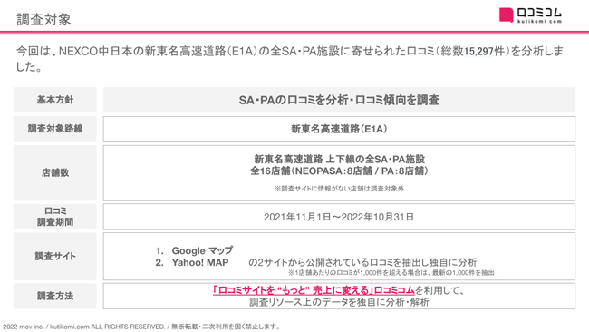 今回は、以下の条件で分析を行っています。NEXCO中日本の新東名高速道路(E1A)の全SA・PA施設に寄せられた口コミ(総数15,297件)を分析しました。