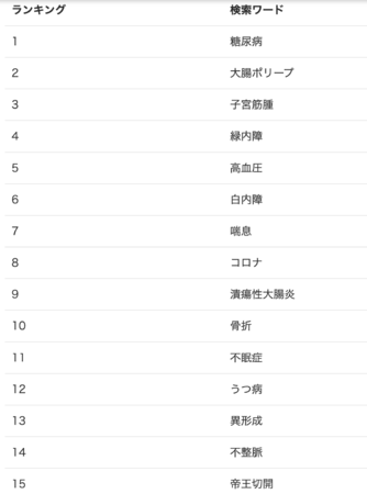 「今回もソリシター君上でユーザーが検索している病名の検索ランキングベスト15を発表させて頂きました。