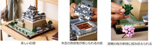 「レゴ(R)アーキテクチャー 姫路城」は、特徴的な渡櫓で繋がる連立式天守の白壁はもちろん、天守閣を外すと木造の床や柱の雰囲気が感じられる簡易的な内部構造もお楽しみいただけます。さらに、天守を取り囲む備前丸跡の緑地には2本の木が立てられ、満開の桜か新緑のどちらかに組み替えることで季節の移ろいを表現することが出来ます。