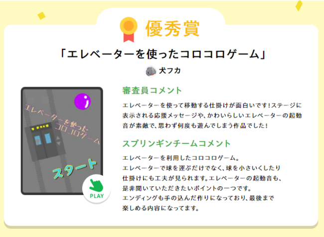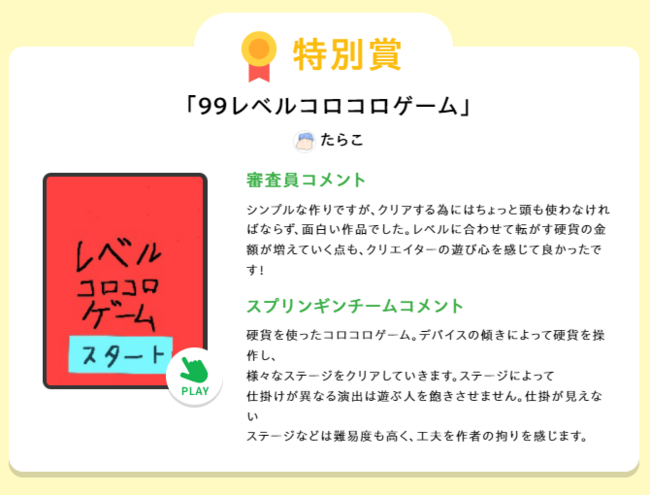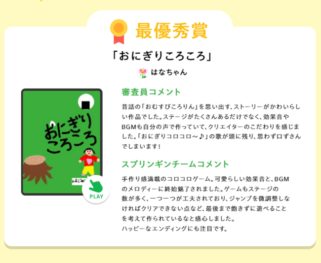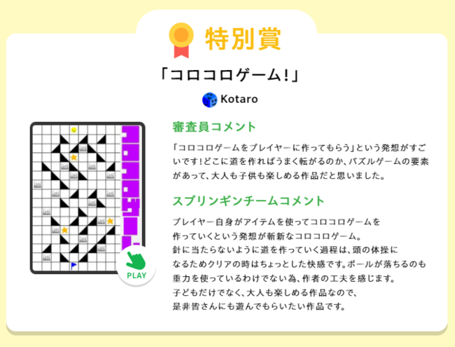 本アワードのテーマは、スプリンギンで簡単に作れる「コロコロゲーム」。プレイヤー自身にコースを作らせてボールを転がすゲームや、昔話「おむすびころりん」から着想を得たゲームなど、様々なコロコロゲームが集まりました。