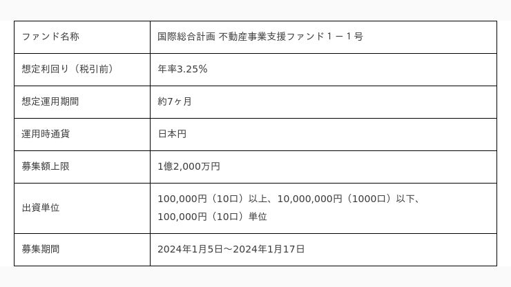 本ファンドは、投資家の皆様からの出資金を、『株式会社国際総合計画』に対し、不動産事業資金として貸付け運用するファンドです。