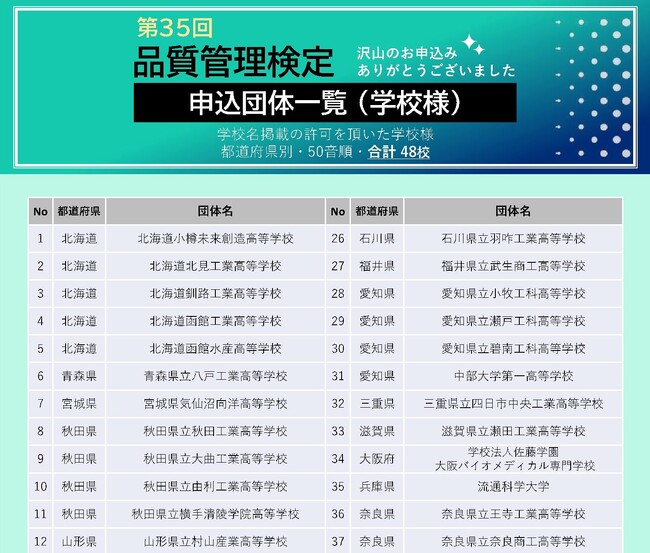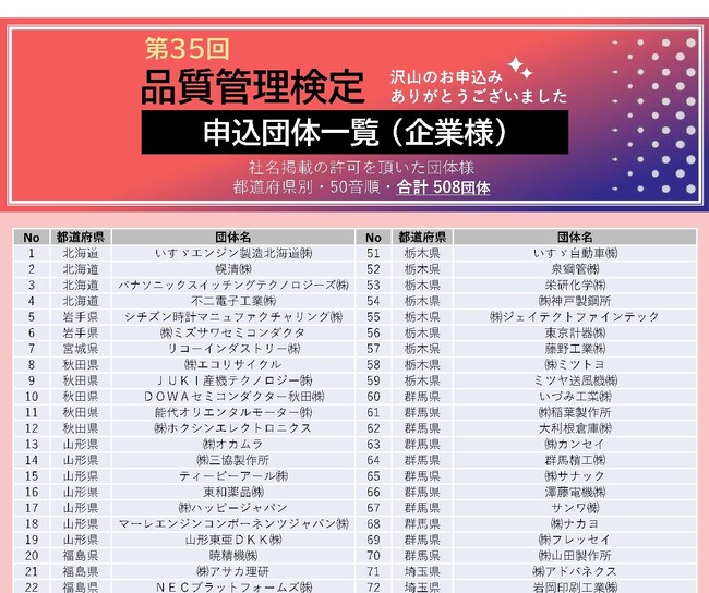 どのような組織がQC検定に取り組んでいるのかをご紹介いたします。下記URLに、第35回QC検定(2023年3月19日)を団体申込みで受検された企業・団体・学校のうち、名称公表の承諾をいただいた組織の一覧を掲載しています。ぜひご確認ください。