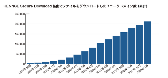 ※3. HENNGE Secure Download経由で添付ファイルを受け取った受信者が、ファイルダウンロード時に本人認証を行ったメールアドレスのドメイン数のうち、著名フリーメールサービス/ISP等のドメインを除いたユニークドメイン数にもとづく当社による推定値(累計)。