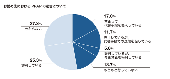HENNGEが2023年2月に情報システム担当者300人を対象に行った「企業のPPAP実施状況把握調査」でも、PPAPでの送信について「禁止して代替手段を導入している」が17.0%、「代替手段での送信を促している」が11.7%、「今後禁止を検討している」が5.0%、「もともと行っていない」が13.7%と、計47.4%がPPAP廃止に向かっていることが明らかになりました。これは、「PPAPでの送信を許可している」と回答した25.3%を大きく上回りました。
